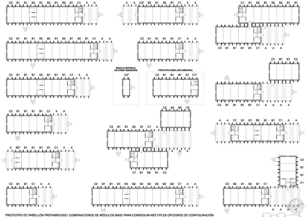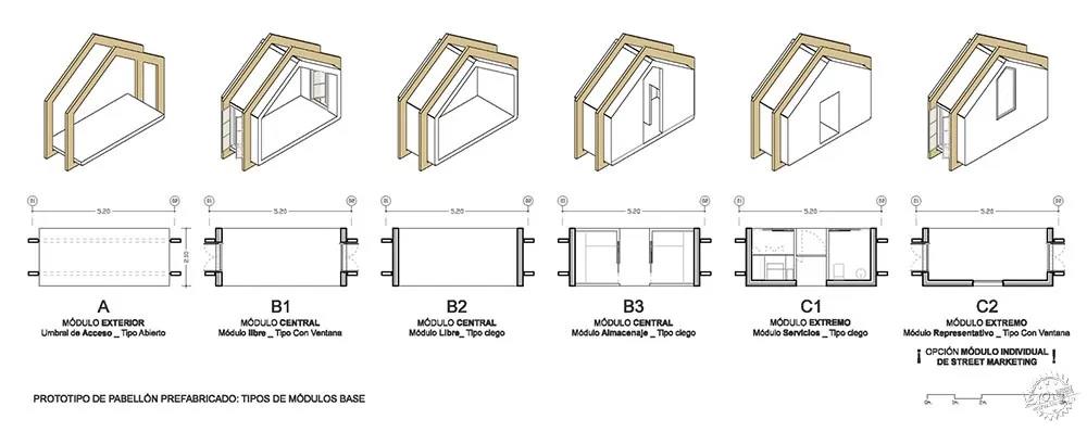 這是一個靈活重配置的工業(yè)體系。預制展館原型基于標準模塊的多種形式,是靈活多變的體系。這種模塊化附加類型項目可以根據(jù)不同的項目需求進行配置,其中包括大型博物館大廳和小規(guī)模辦公室等多種組合。