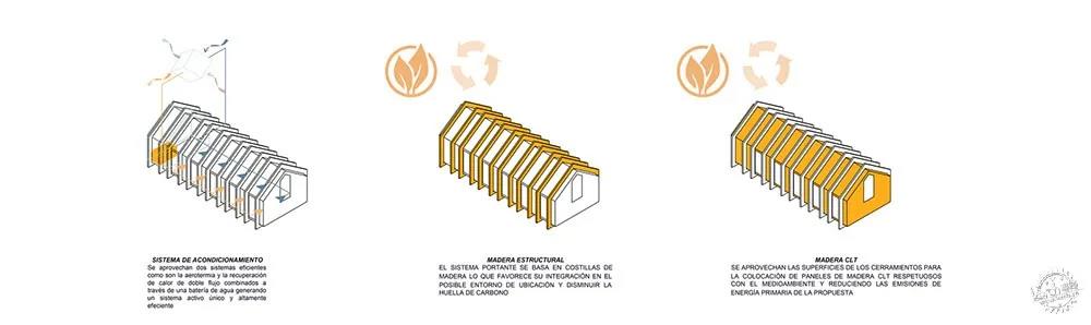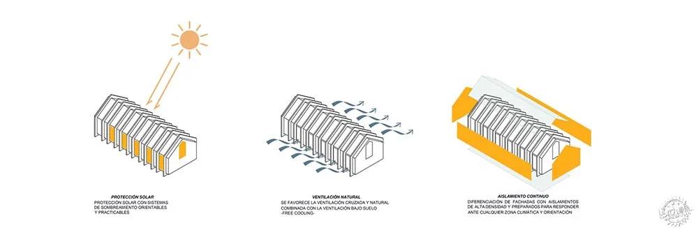 全球化設(shè)計以減少需求為基礎(chǔ),注重節(jié)能標準,建筑師應用了許多被動式策略,其中包括緊湊連續(xù)的隔熱系統(tǒng)、適應性太陽能保護體系、動態(tài)負荷控制或自然通風體系。在高峰需求時,項目的目標是在5/7天的10/24小時中實行連貫的積極策略,將消耗降至最低。除此之外,建筑師還在整個項目中結(jié)合應用空氣熱能和雙流熱焓回熱器,這可以通風與控制溫度,另外再利用空氣熱能和地暖來減少耗能。