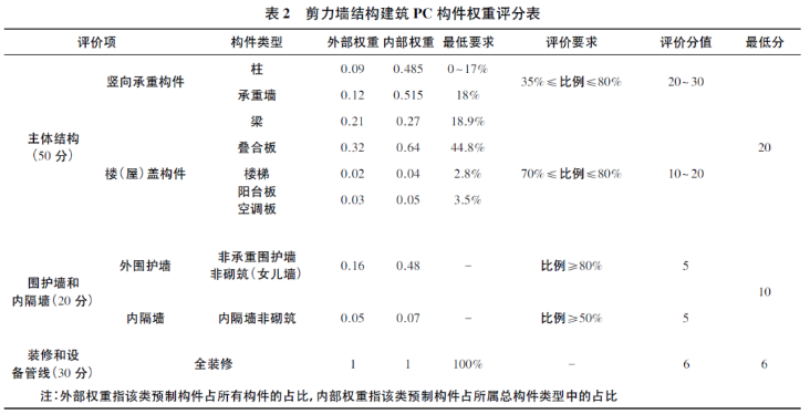 鑒于剪力墻結(jié)構(gòu)在我國的普及性,本文以裝配式剪力墻結(jié)構(gòu)體系為研究對象,通過對我國11項代表性裝配式建筑工程的統(tǒng)計分析,得出裝配式建筑剪力墻結(jié)構(gòu)的外部權(quán)重和內(nèi)部權(quán)重,以及評級標準規(guī)定的單項構(gòu)件預(yù)制率的最低要求,結(jié)合《標準》評分表,剪力墻結(jié)構(gòu)預(yù)制構(gòu)件率最低要求和相應(yīng)權(quán)重如表2所示。