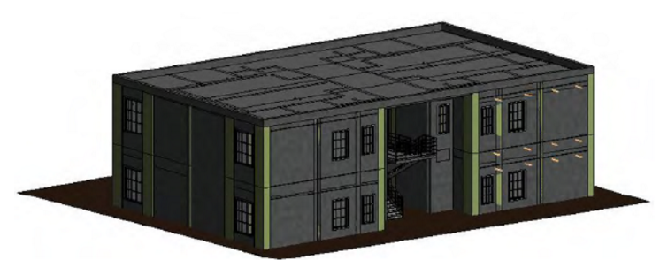 本工程為兩層剪力墻結(jié)構(gòu)住宅,共計4戶,二類建筑,采用65㎡標準化戶型模塊,建筑總面積570.16㎡,共兩層,采用裝配剪力墻結(jié)構(gòu)體系,目標裝配率為78%,AA級裝配式建筑,工程全裝修。圖4為本工程的BIM三維圖。