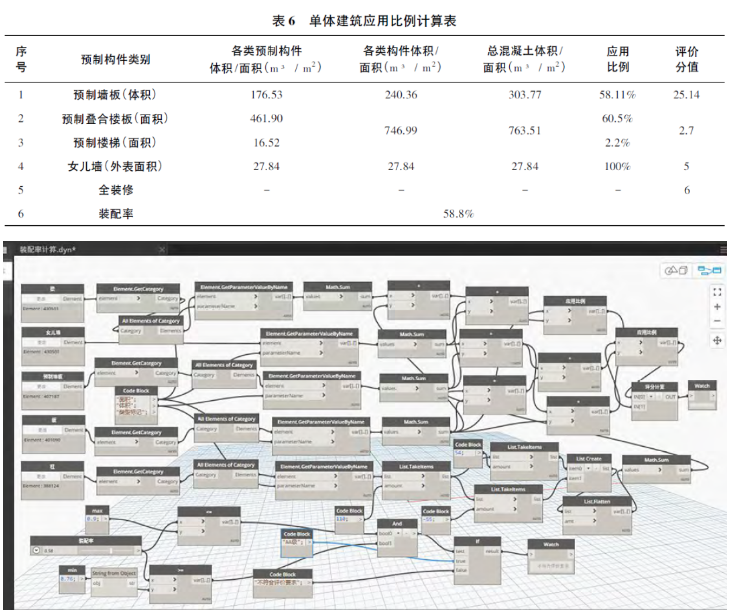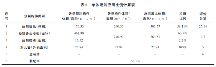當樓梯、內(nèi)墻、剪力墻、疊合板、女兒墻等構(gòu)件分別采用預(yù)制構(gòu)件的情況下,利用BIM通過計算規(guī)則計算預(yù)制部品部件的應(yīng)用比例,其應(yīng)用比例計算結(jié)果見表6。