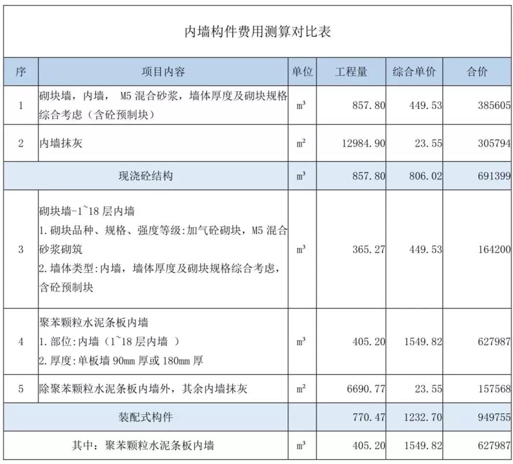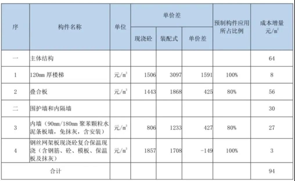 以下重點分析主體結(jié)構(gòu)和維護墻、內(nèi)墻墻部分的成本增量。項目整體的成本增量還要考慮裝修和設(shè)備管線的成本增量,還要考慮設(shè)計咨詢、施工措施、結(jié)構(gòu)設(shè)計等方面的成本加因素。成本增量測算方法請點擊:以裝配式建筑的增量成本最低化為目標(biāo)的成本測算基礎(chǔ)(3.0版)